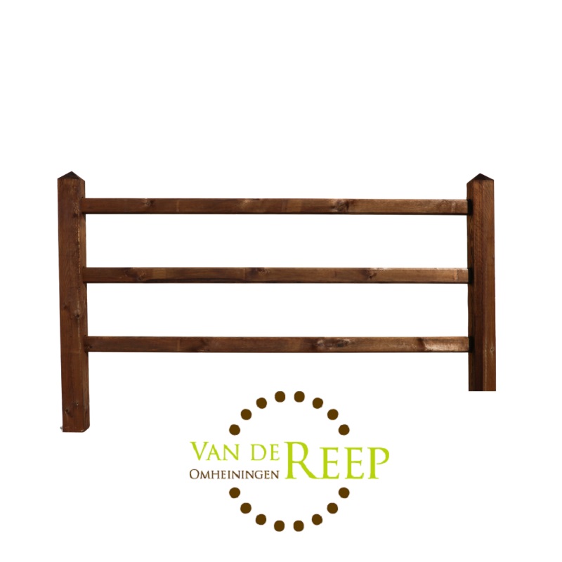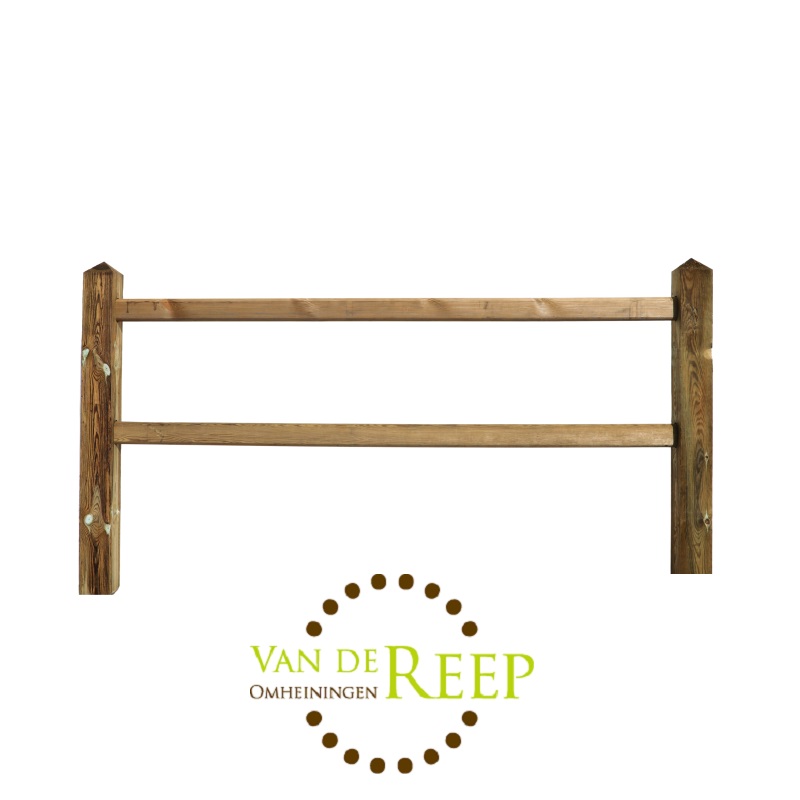 Deze doorsteek omheining kan bestaan uit vierkant gefreesde palen met een diameter van 12 cm, beschikbaar in lengtes van 200 of 220 cm. De palen zijn voorzien van twee of drie liggers van 45 x 95 mm, met een paalafstand van 2,5 of 3 meter.